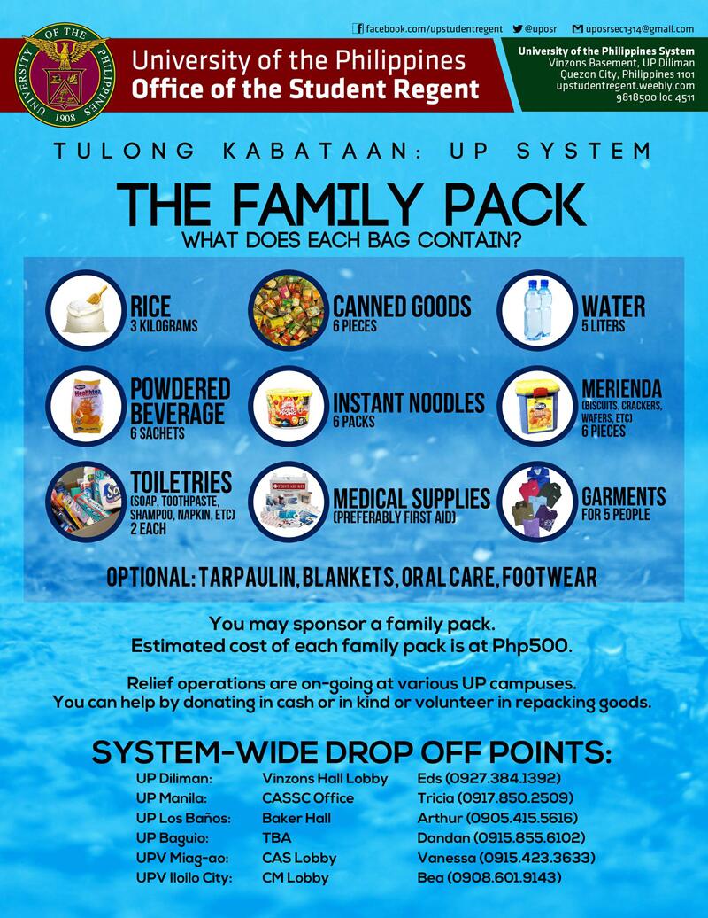 Another announcement from the University of the Philippines Office of the Student Regent, from the UP System Twitter page details what donations are most in need in their repacking endeavors. The Family Pack contains: